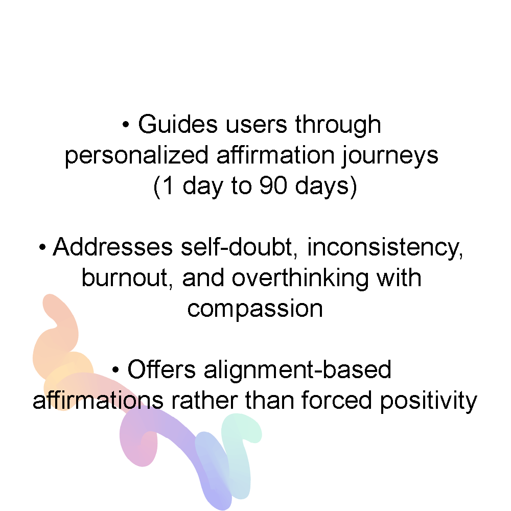 • Guides users through personalized affirmation journeys (1 day to 90 days)