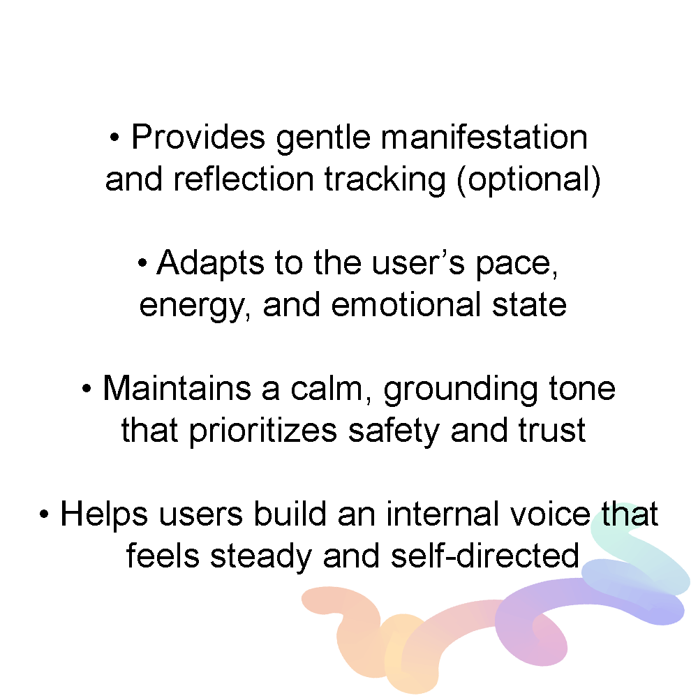 is a calm, supportive AI guide designed to help people strengthen confidence, clarity, and self-trust—without pressure or forced positivity. It works by meeting users where they are emotionally and mentally, then helping them reconnect with their inner authority through grounded affirmations and reflective prompts. Rather than pushing outcomes, it focuses on alignment: small, sustainable shifts that feel true and attainable. This makes growth feel safe, personal, and integrated instead of overwhelming.